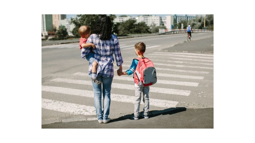 Ve druhé ruce drží velkou tašku s nákupem. Rohlíky, celý chleba, 2 mléka, máslo, čerstvé smetánky, jablka, něco na večeři, něco na víkend. Děti se jí do tašky dobývají.